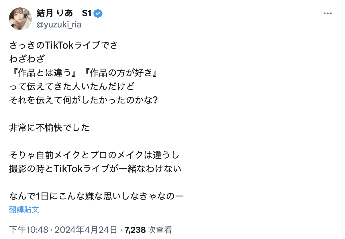 这话不用我翻译了,结月りあ(结月莉亚)说自己化妆和专业化妆出来的感觉就是不一样,Tiktok直播和摄影也是截然不同,为什么自己要被那些留言搞得那么不愉快?