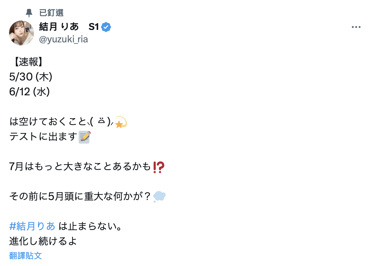 其实没有,就经纪公司的说法是她的新片情报即将解禁,只是目前没办法曝光;结月りあ(结月莉亚)也在X(https://twitter.com/yuzuki_ria)的置顶贴文说5月初和7月都会有大事宣布,同时她也强调自己永不停息、还在进化: